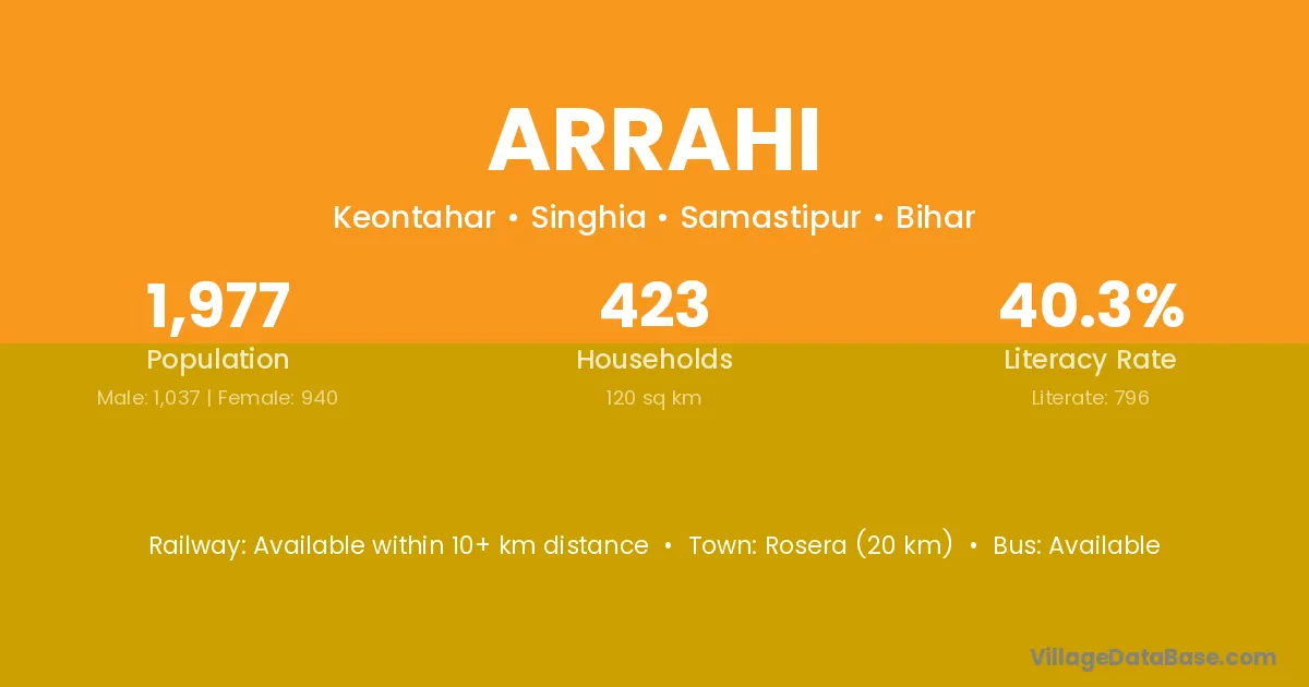 The literacy rate of Arrahi village is 40.26%. Male literacy stands at 50.92% and female literacy at 28.51%.