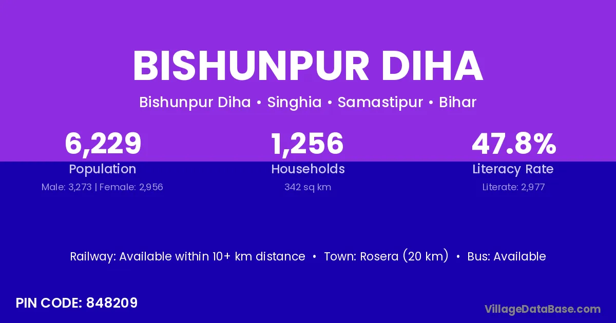 Rosera (20 km) is the nearest town to Bishunpur Diha village for major economic activities and is located approximately 20 km away.