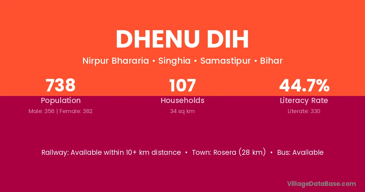 Rosera (28 km) is the nearest town to Dhenu Dih village for major economic activities and is located approximately 28 km away.