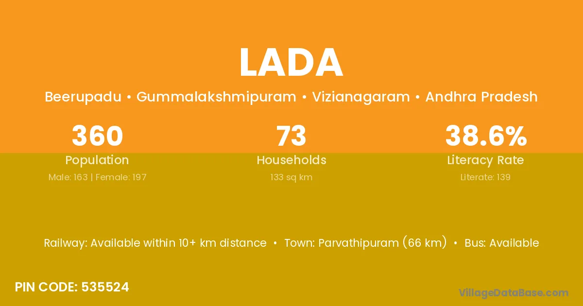 The literacy rate of Lada village is 41.24%. Male literacy stands at 50.70% and female literacy at 31.28%.