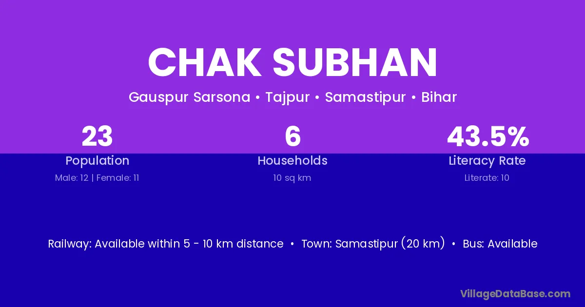 Samastipur (20 km) is the nearest town to Chak Subhan village for major economic activities and is located approximately 20 km away.
