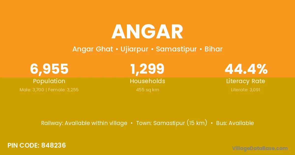 Samastipur (15 km) is the nearest town to Angar village for major economic activities and is located approximately 15 km away.
