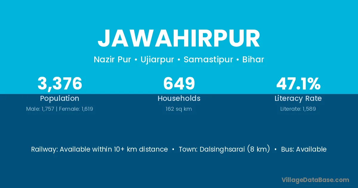 Dalsinghsarai (8 km) is the nearest town to Jawahirpur village for major economic activities and is located approximately 8 km away.