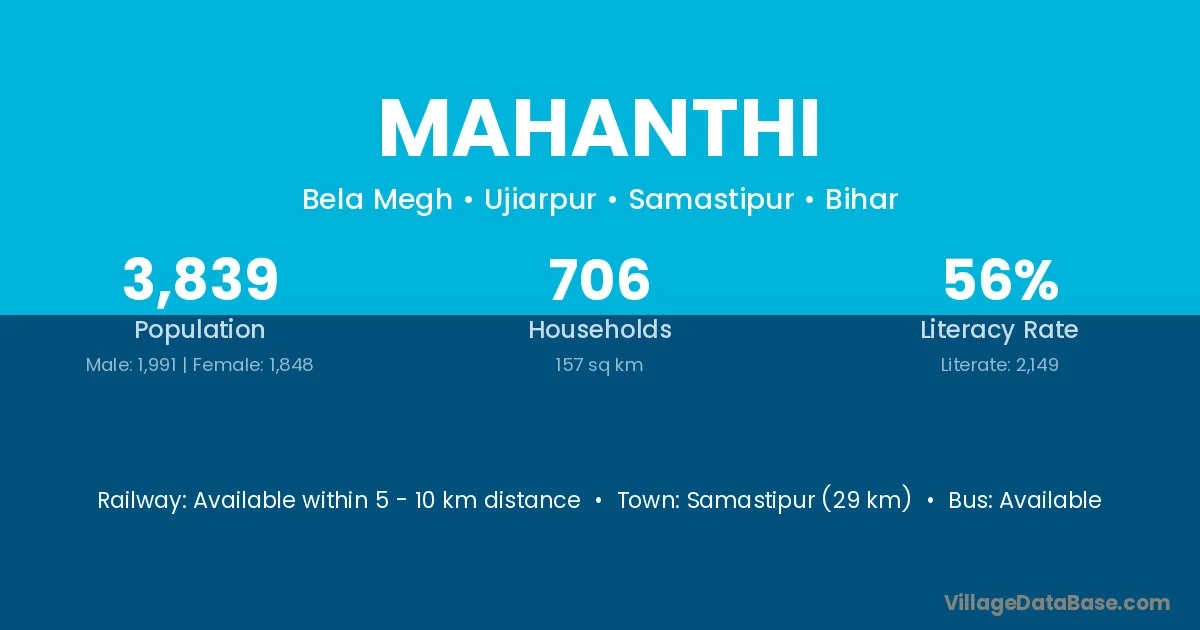 Samastipur (29 km) is the nearest town to Mahanthi village for major economic activities and is located approximately 29 km away.