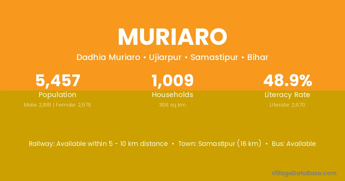 Samastipur (16 km) is the nearest town to Muriaro village for major economic activities and is located approximately 16 km away.