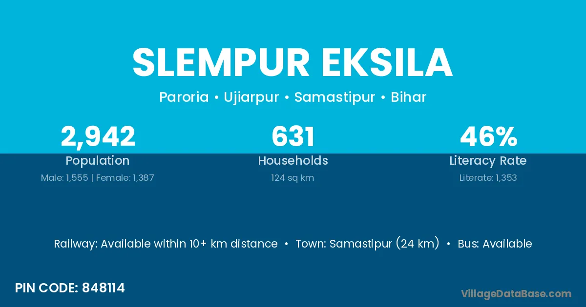 Samastipur (24 km) is the nearest town to Slempur Eksila village for major economic activities and is located approximately 24 km away.