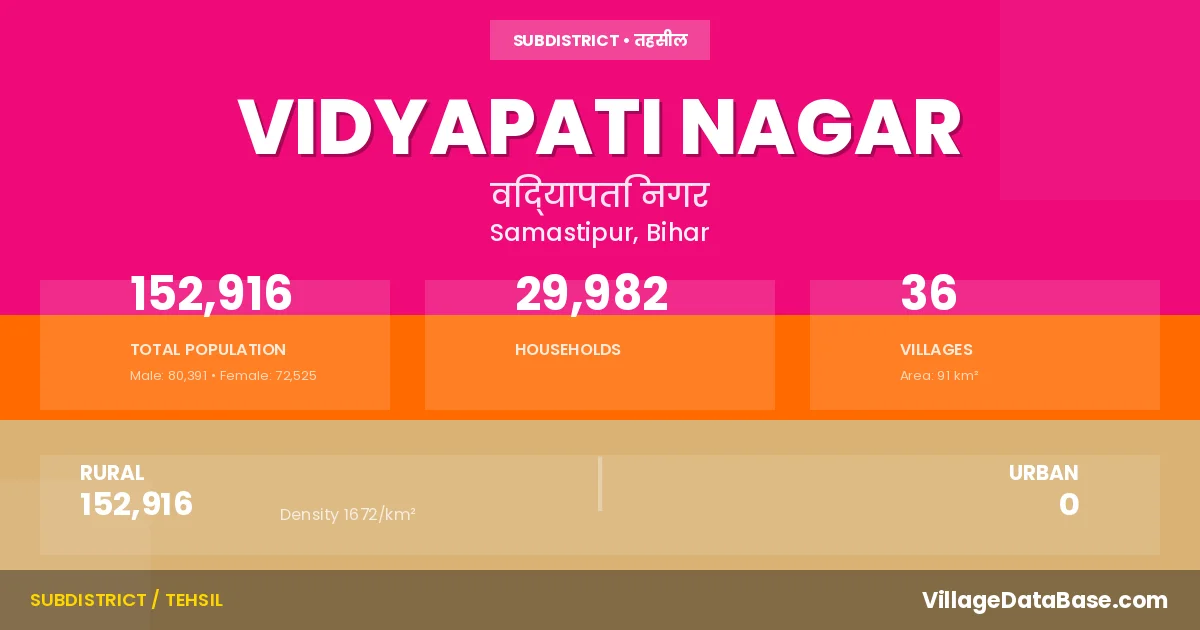 According to the 2011 census The total area of Vidyapati Nagar Subdivision is 91 km², with a population of 152916 people. The population density is 1,672 inhabitants per square kilometre, and there are approximately 29982 houses in the sub district.