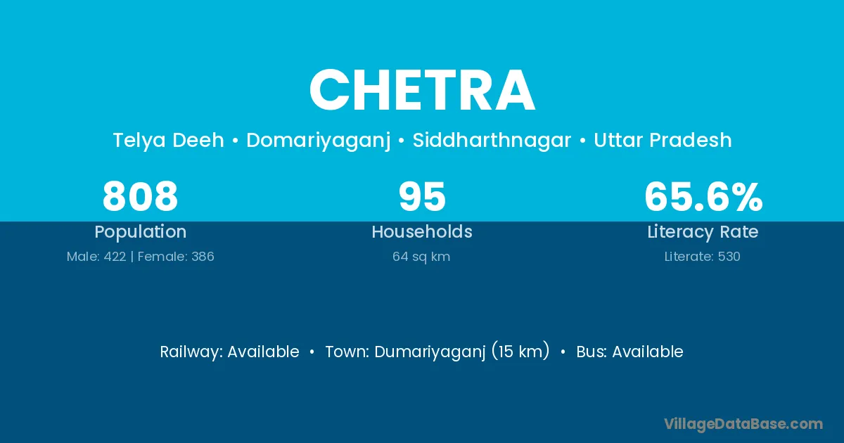The literacy rate of Chetra village is 44.99%. Male literacy stands at 51.99% and female literacy at 36.93%.