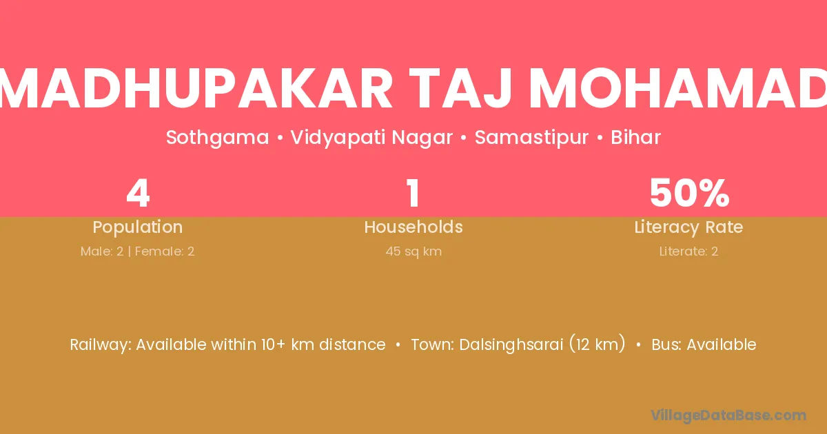 Madhupakar Taj Mohamad village has a total population of 4 people, of which 2 are males and 2 are females.