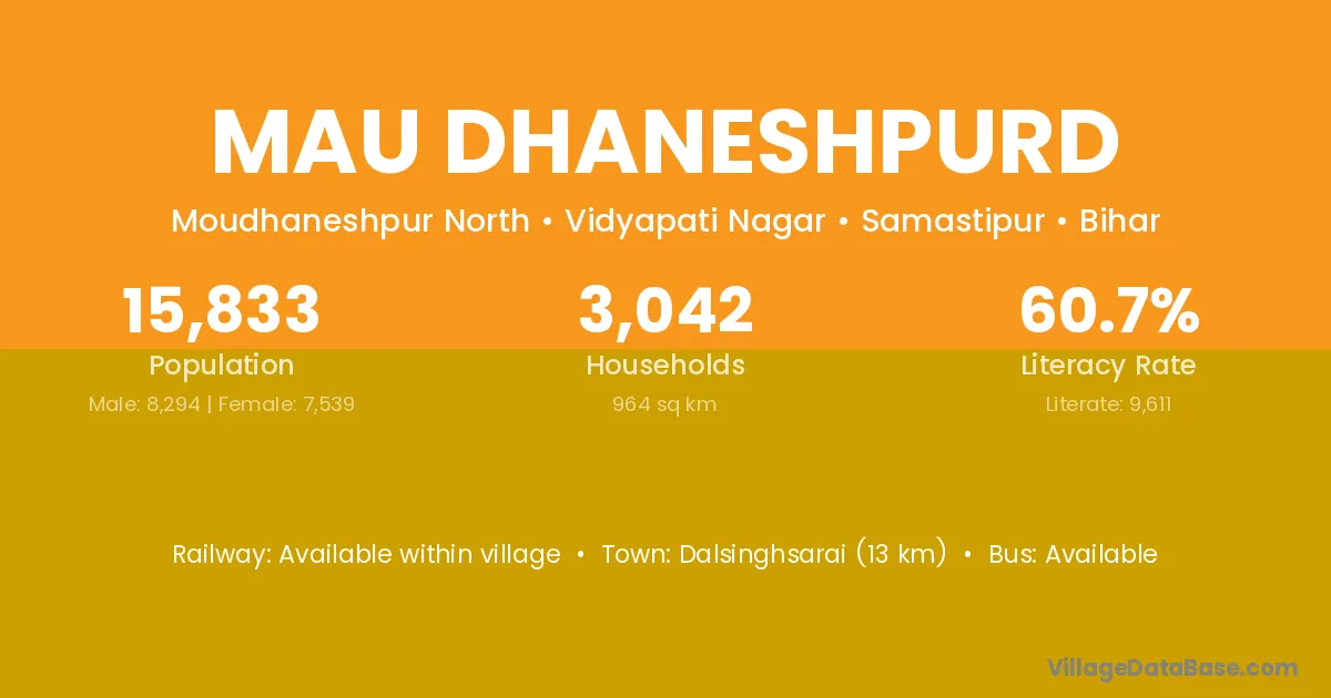 Dalsinghsarai (13 km) is the nearest town to Mau Dhaneshpurd village for major economic activities and is located approximately 13 km away.