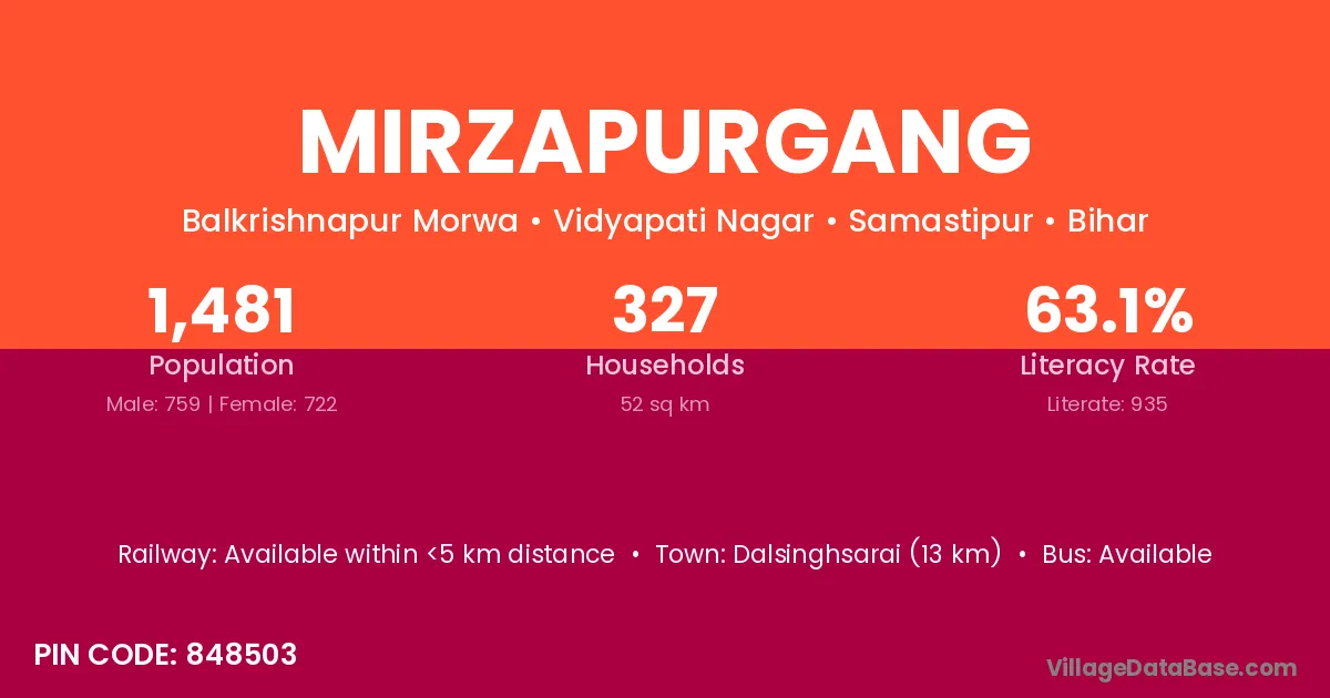 Dalsinghsarai (13 km) is the nearest town to Mirzapurgang village for major economic activities and is located approximately 13 km away.
