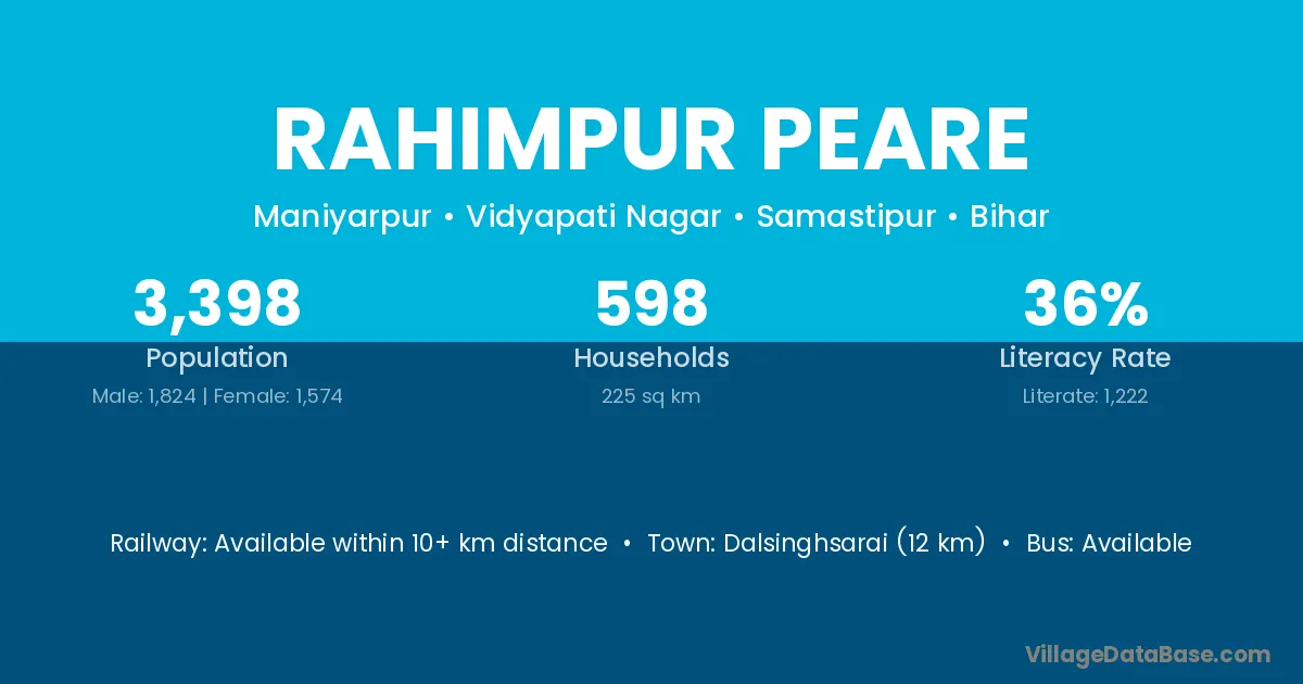 Dalsinghsarai (12 km) is the nearest town to Rahimpur Peare village for major economic activities and is located approximately 12 km away.