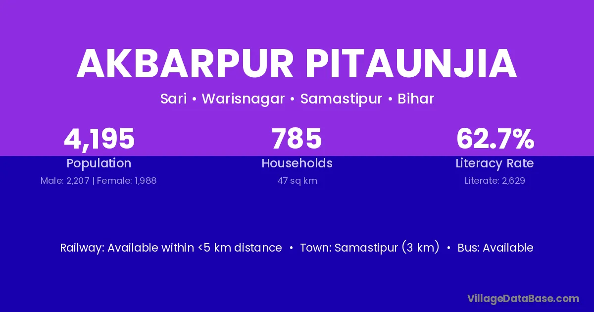Samastipur (3 km) is the nearest town to Akbarpur Pitaunjia village for major economic activities and is located approximately 3 km away.