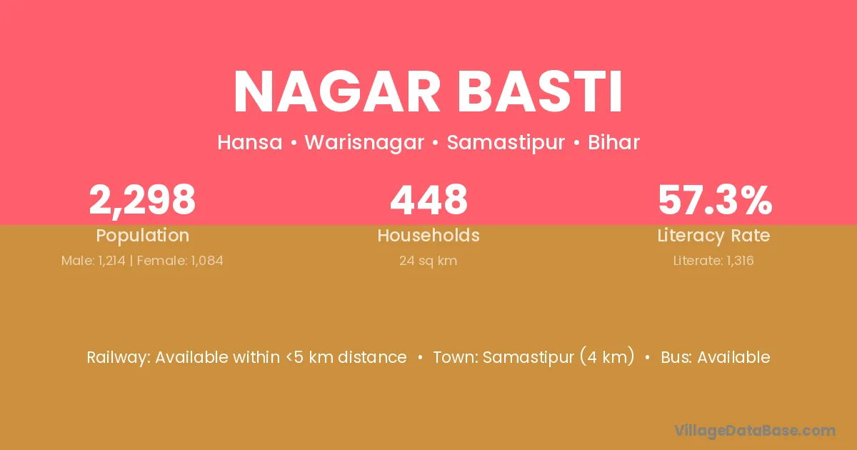 Samastipur (4 km) is the nearest town to Nagar Basti village for major economic activities and is located approximately 4 km away.