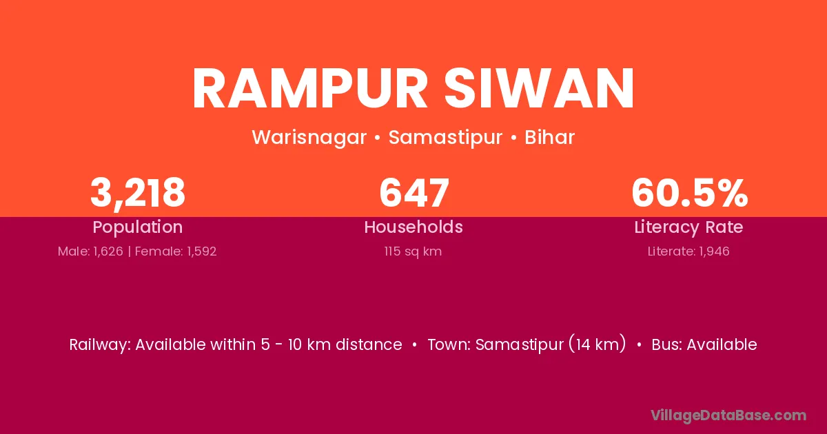 Samastipur (14 km) is the nearest town to Rampur Siwan village for major economic activities and is located approximately 14 km away.