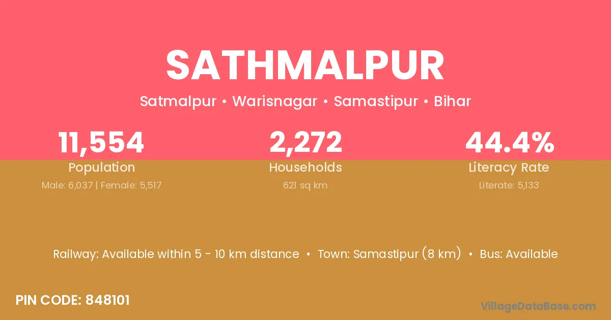 Samastipur (8 km) is the nearest town to Sathmalpur village for major economic activities and is located approximately 8 km away.