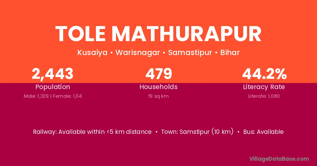 Samstipur (10 km) is the nearest town to Tole Mathurapur village for major economic activities and is located approximately 10 km away.