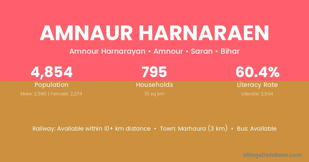 Marhaura (3 km) is the nearest town to Amnaur Harnaraen village for major economic activities and is located approximately 3 km away.