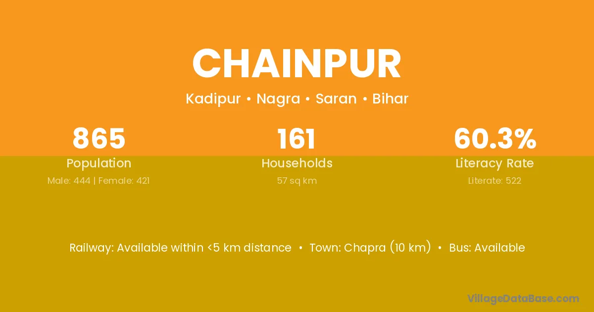 Chapra (27 km) is the nearest town to Chainpur village for major economic activities and is located approximately 27 km away.
