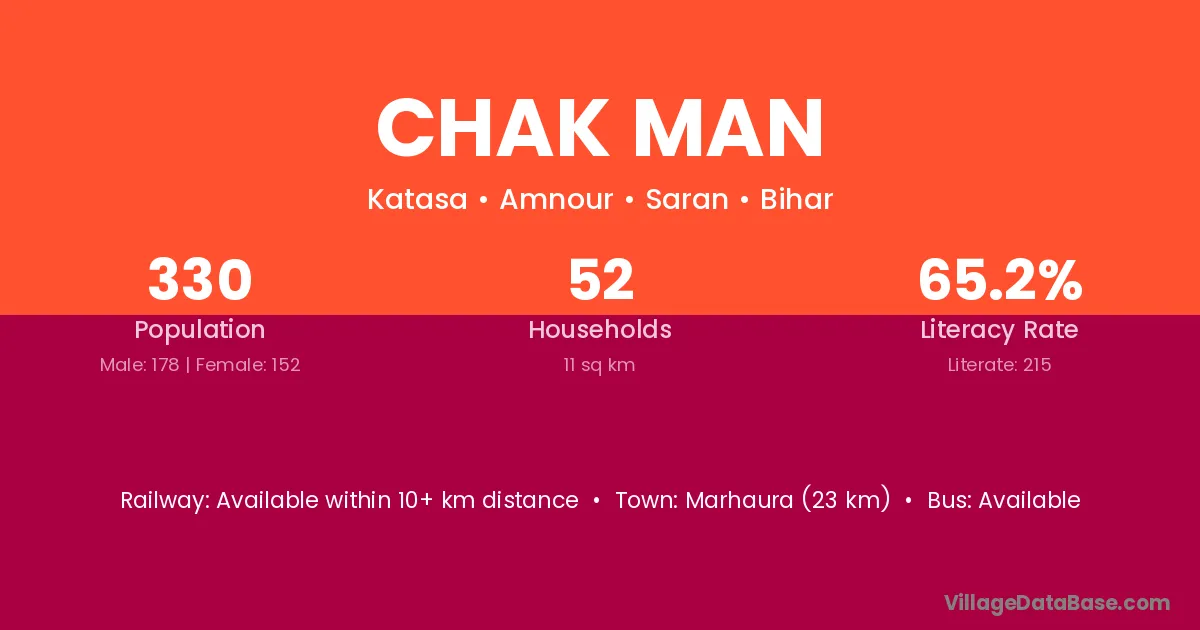 Marhaura (23 km) is the nearest town to Chak Man village for major economic activities and is located approximately 23 km away.