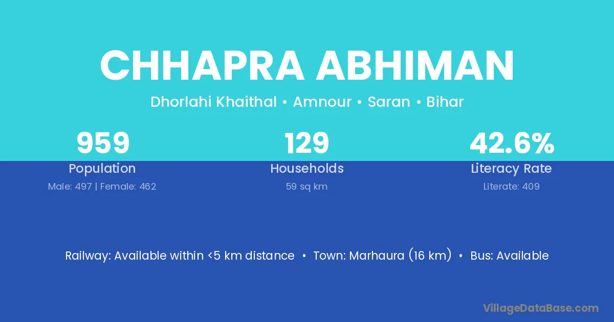 Marhaura (16 km) is the nearest town to Chhapra Abhiman village for major economic activities and is located approximately 16 km away.