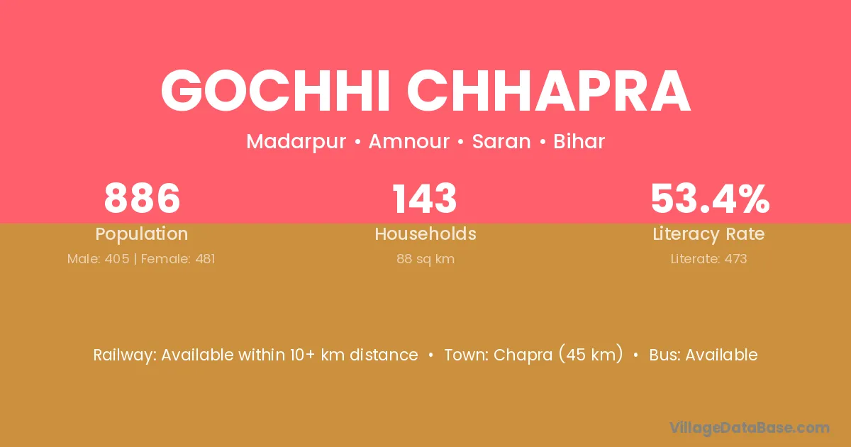 Gochhi Chhapra village has a total population of 886 people, of which 405 are males and 481 are females.