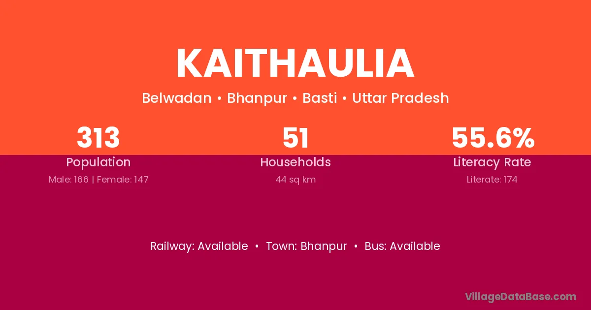 The literacy rate of Kaithaulia village is 71.54%. Male literacy stands at 83.08% and female literacy at 60.00%.