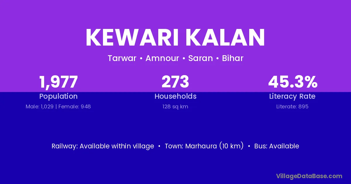Marhaura (10 km) is the nearest town to Kewari Kalan village for major economic activities and is located approximately 10 km away.