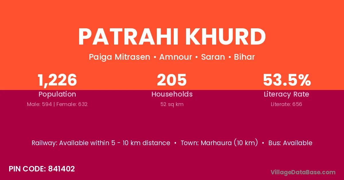 Marhaura (10 km) is the nearest town to Patrahi Khurd village for major economic activities and is located approximately 10 km away.