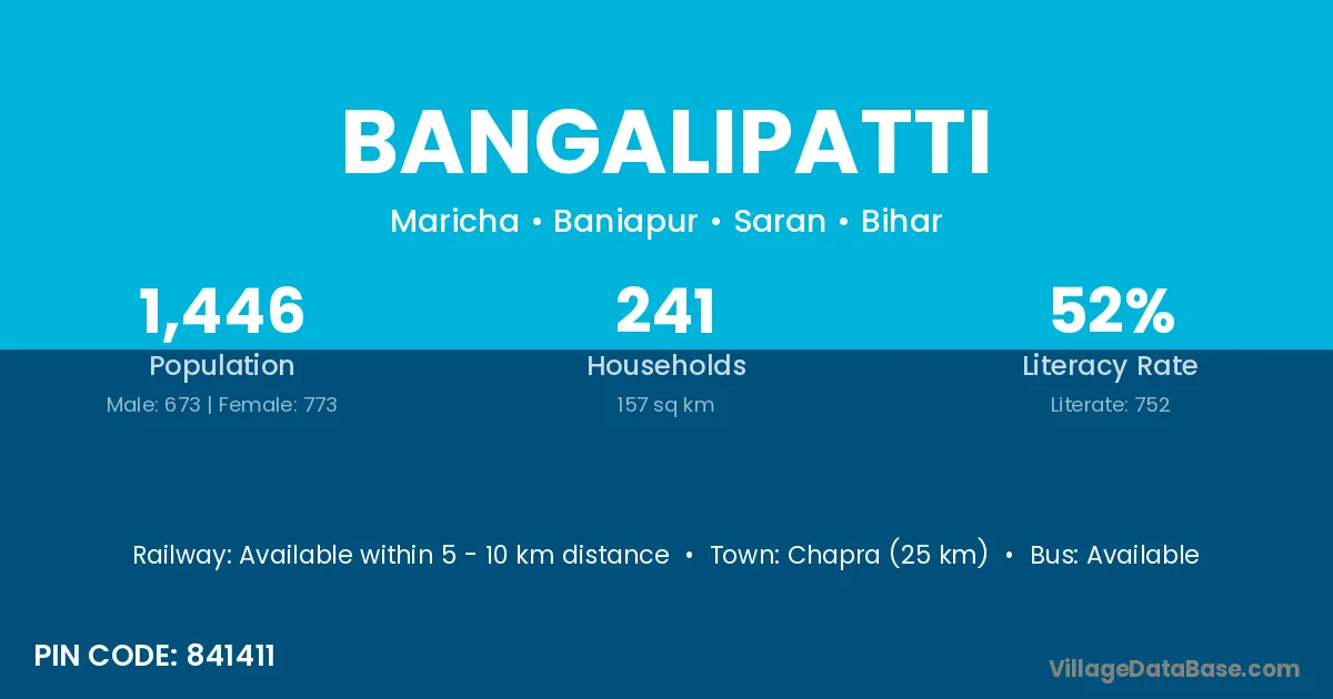 Chapra (25 km) is the nearest town to Bangalipatti village for major economic activities and is located approximately 25 km away.