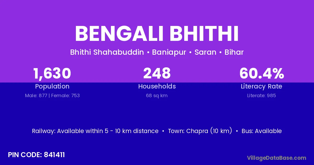 Chapra (10 km) is the nearest town to Bengali Bhithi village for major economic activities and is located approximately 10 km away.