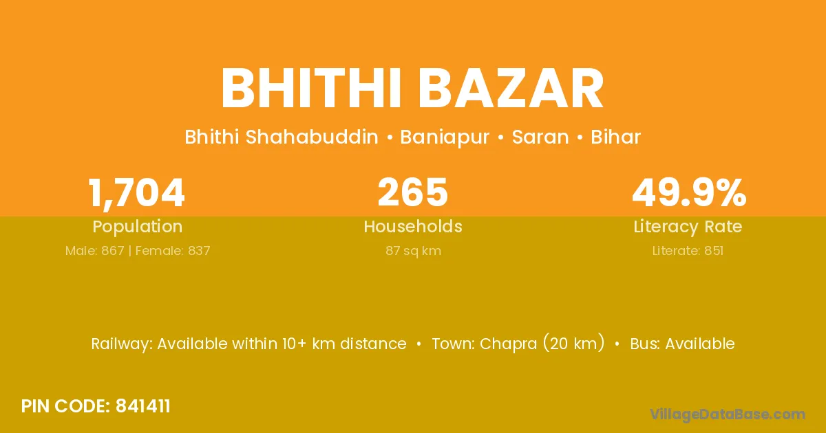 Chapra (20 km) is the nearest town to Bhithi Bazar village for major economic activities and is located approximately 20 km away.
