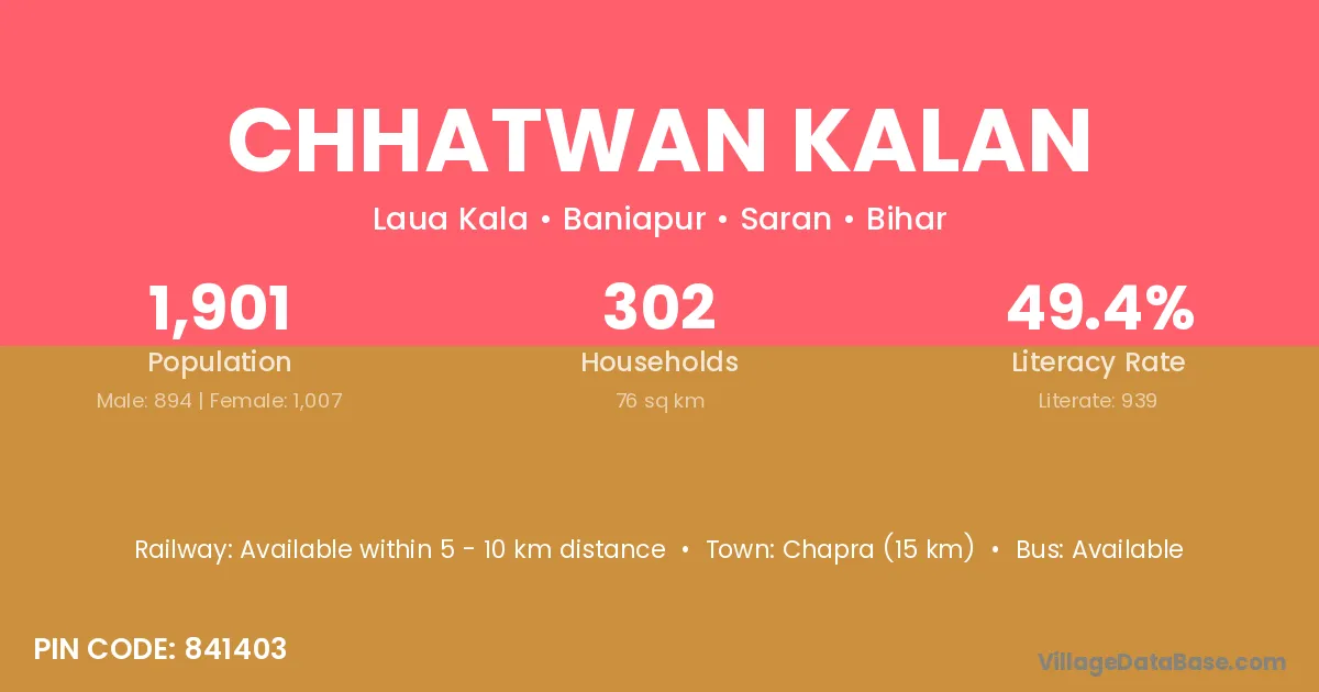 Chapra (15 km) is the nearest town to Chhatwan Kalan village for major economic activities and is located approximately 15 km away.