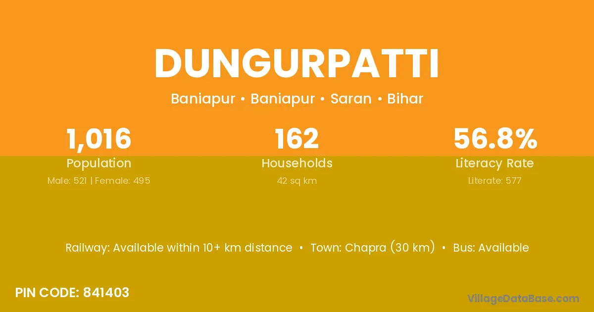 Chapra (30 km) is the nearest town to Dungurpatti village for major economic activities and is located approximately 30 km away.