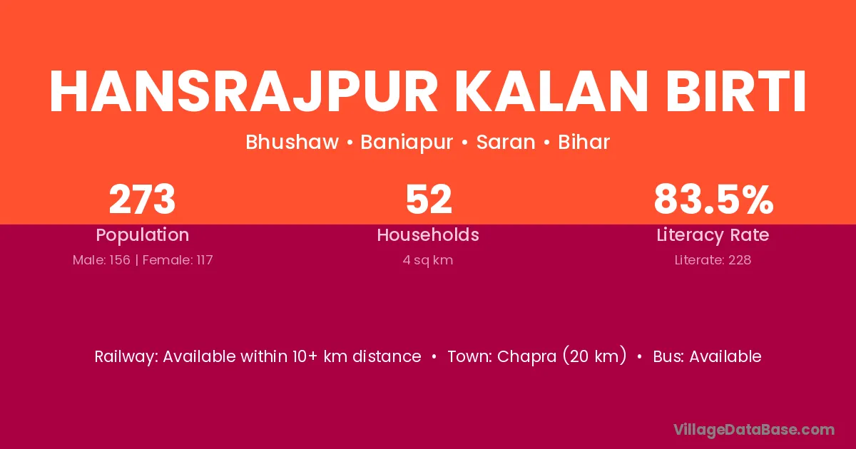 Chapra (20 km) is the nearest town to Hansrajpur Kalan Birti village for major economic activities and is located approximately 20 km away.