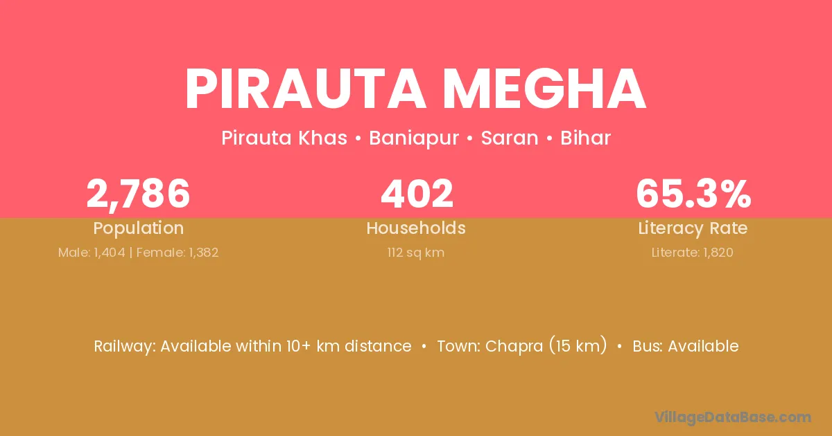 Chapra (15 km) is the nearest town to Pirauta Megha village for major economic activities and is located approximately 15 km away.