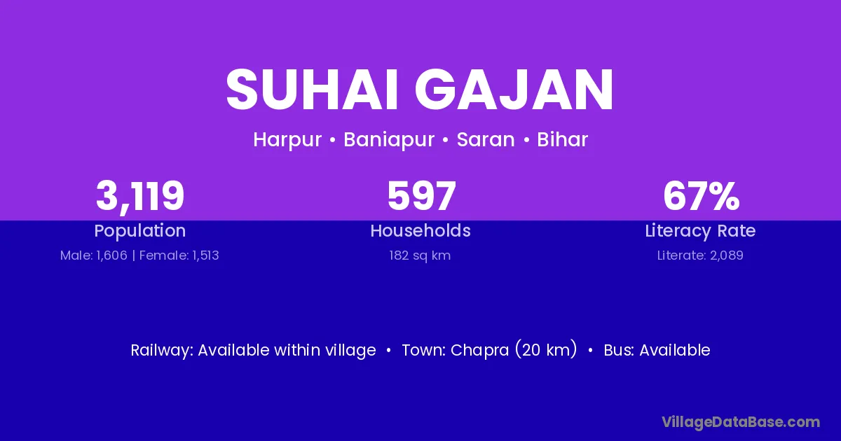 Chapra (20 km) is the nearest town to Suhai Gajan village for major economic activities and is located approximately 20 km away.
