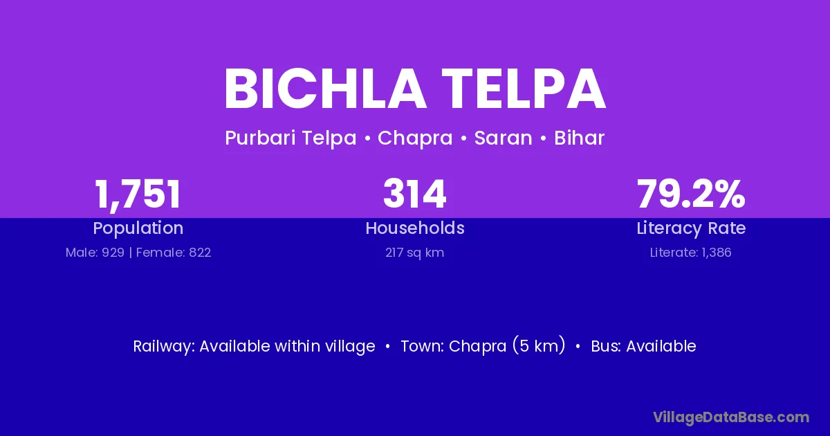 Chapra (5 km) is the nearest town to Bichla Telpa village for major economic activities and is located approximately 5 km away.