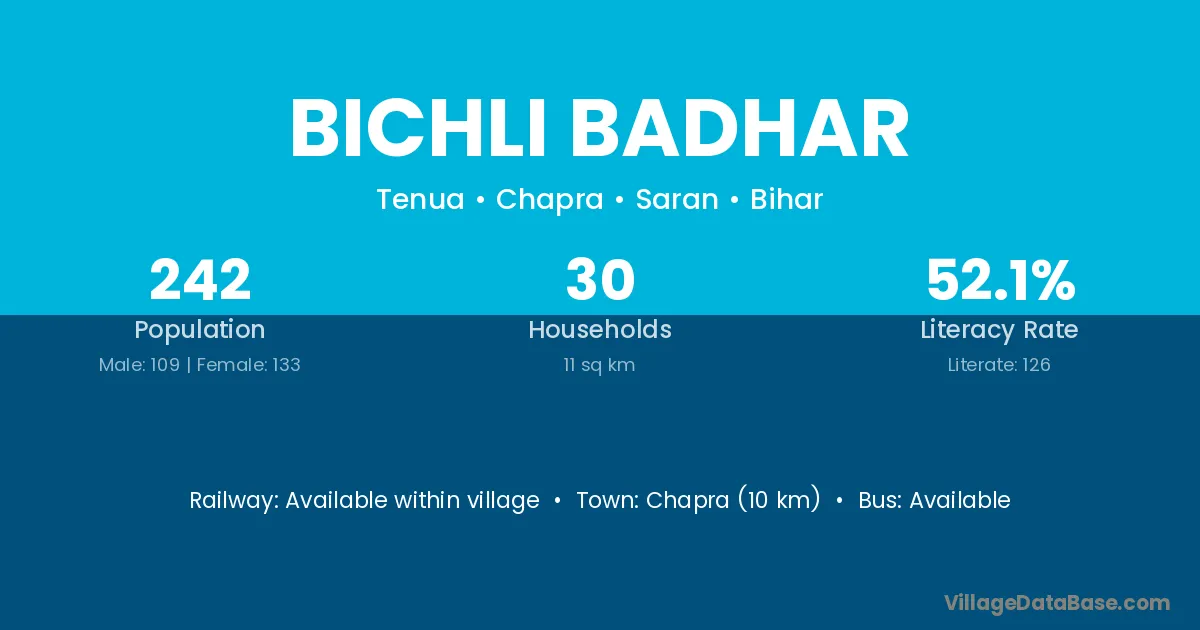 Chapra (10 km) is the nearest town to Bichli Badhar village for major economic activities and is located approximately 10 km away.