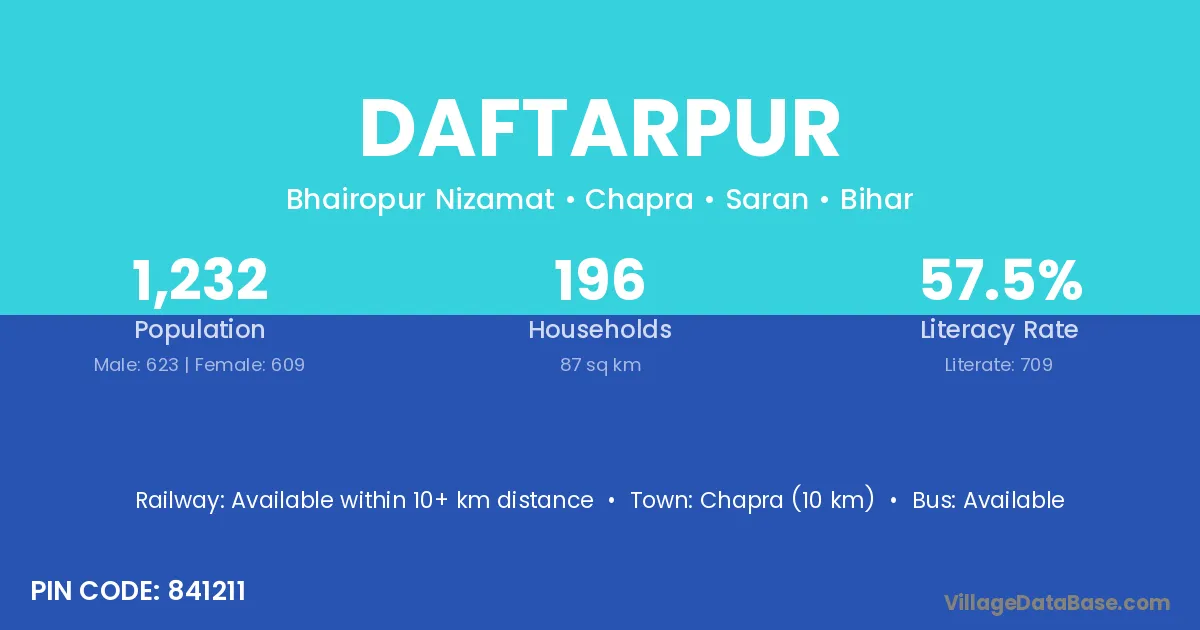 Chapra (10 km) is the nearest town to Daftarpur village for major economic activities and is located approximately 10 km away.