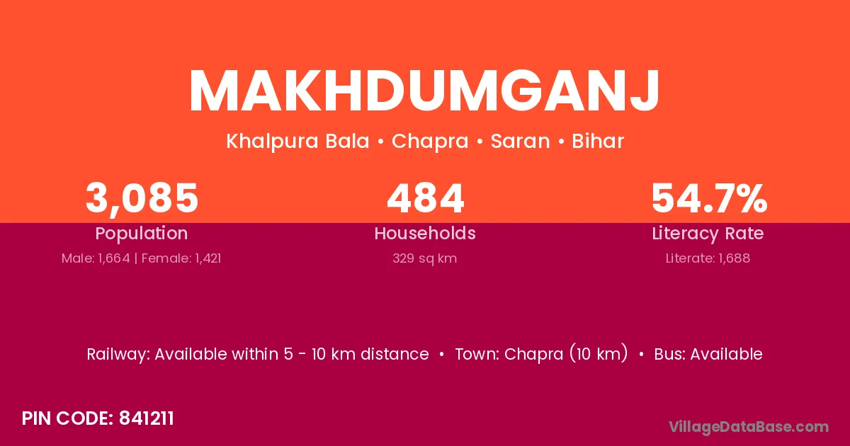 Chapra (10 km) is the nearest town to Makhdumganj village for major economic activities and is located approximately 10 km away.
