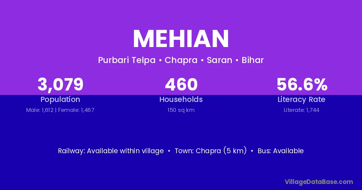 Chapra (5 km) is the nearest town to Mehian village for major economic activities and is located approximately 5 km away.