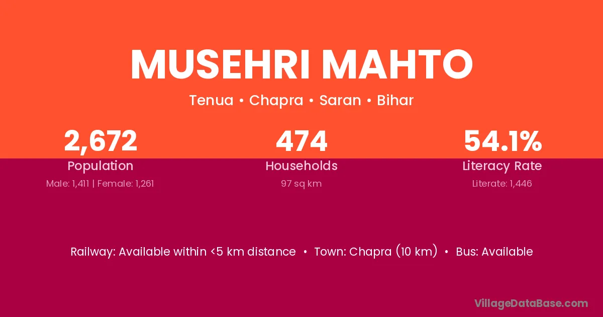 Chapra (10 km) is the nearest town to Musehri Mahto village for major economic activities and is located approximately 10 km away.