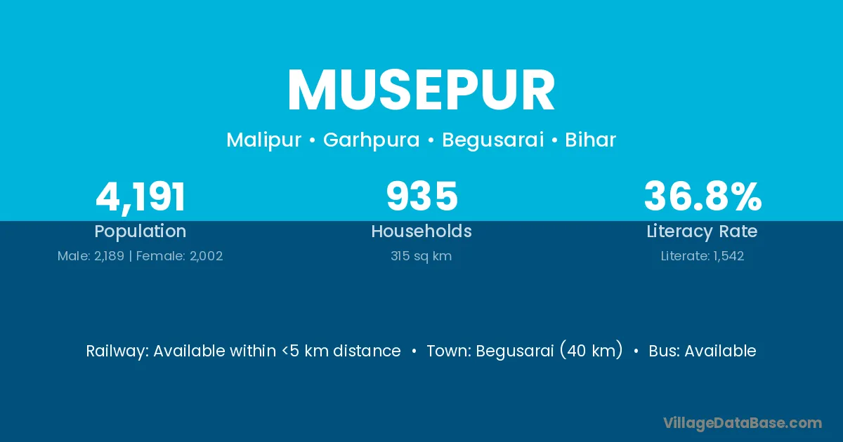 The literacy rate of Musepur village is 50.68%. Male literacy stands at 60.60% and female literacy at 39.78%.