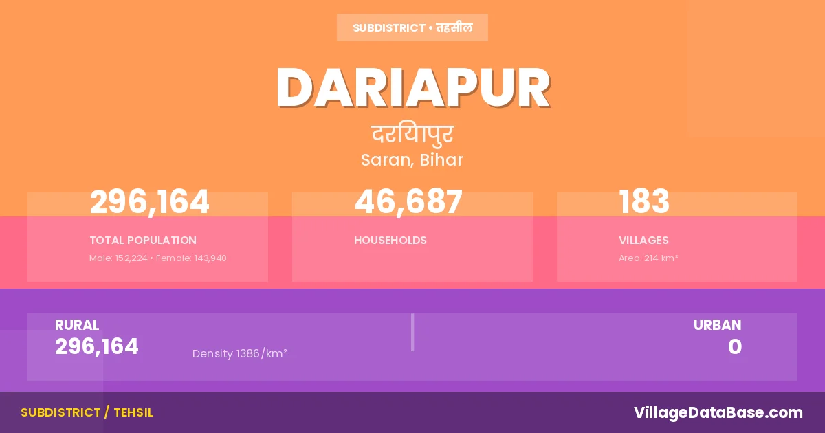 Dariapur is a town and Subdivision in the Saran district of the Bihar. In India, a Subdivision is a subdivision of a district responsible for the administration and revenue collection of a specific area within the district. Subdivisions play a crucial role in the local governance structure, contributing significantly to the development and administration of their communities.