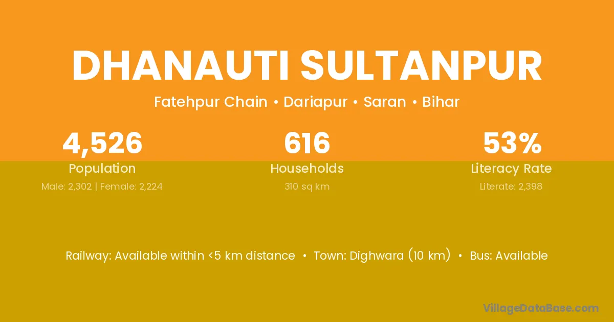Dighwara (10 km) is the nearest town to Dhanauti Sultanpur village for major economic activities and is located approximately 10 km away.