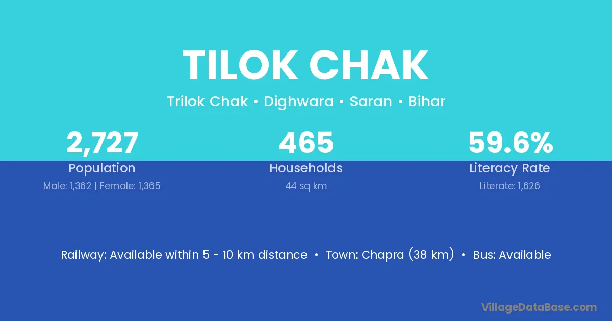 Chapra (38 km) is the nearest town to Tilok Chak village for major economic activities and is located approximately 38 km away.