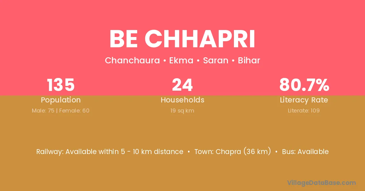 Be Chhapri village has a total population of 135 people, of which 75 are males and 60 are females.