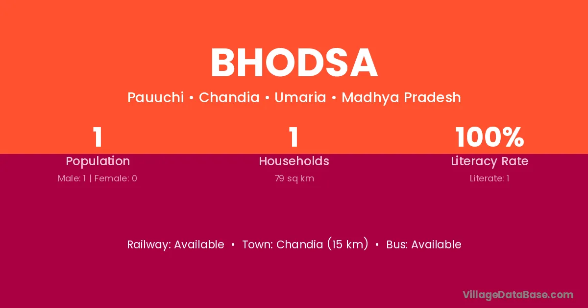 The literacy rate of Bhodsa village is 55.93%. Male literacy stands at 68.31% and female literacy at 42.22%.