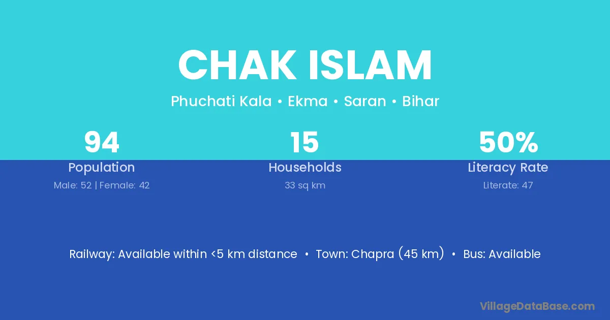 Chapra (45 km) is the nearest town to Chak Islam village for major economic activities and is located approximately 45 km away.